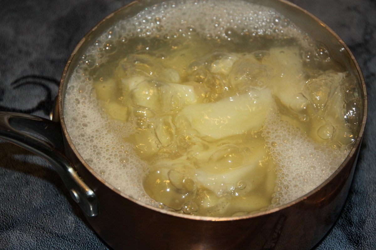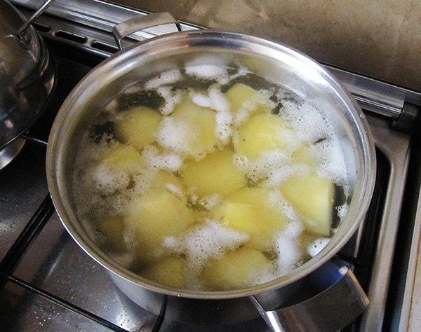 1. Pentru început, curățăm cartofii. Îi punem la fiert la foc mic într-o oală cu apă.