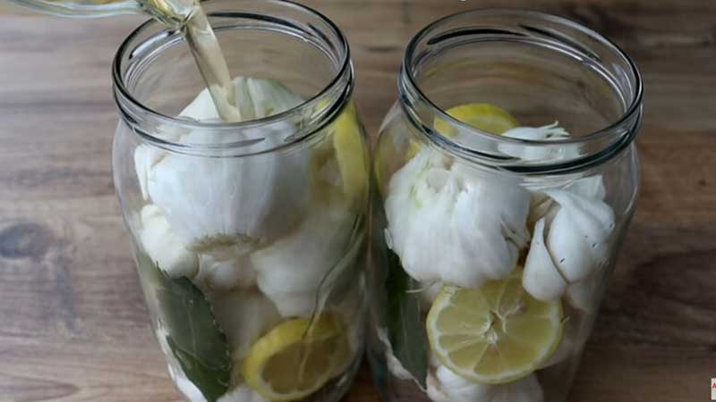 Așează usturoiul în borcane, intercalându-l cu feliile de lămâie și frunzele de dafin. Asigură-te că usturoiul este distribuit uniform.