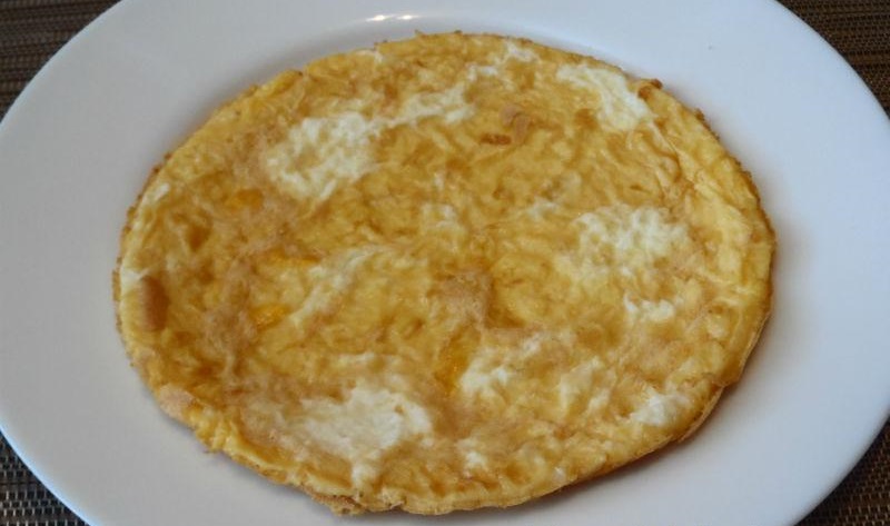 2. Într-un bol separat, batem 3 gălbenușuri și 1 albuș. Turnăm compoziția într-o tigaie încinsă, fărăr ulei, și coacem o clătită. Procedăn la fel cu restul de ouă. În final trebuie sa obținem 3 clătite.