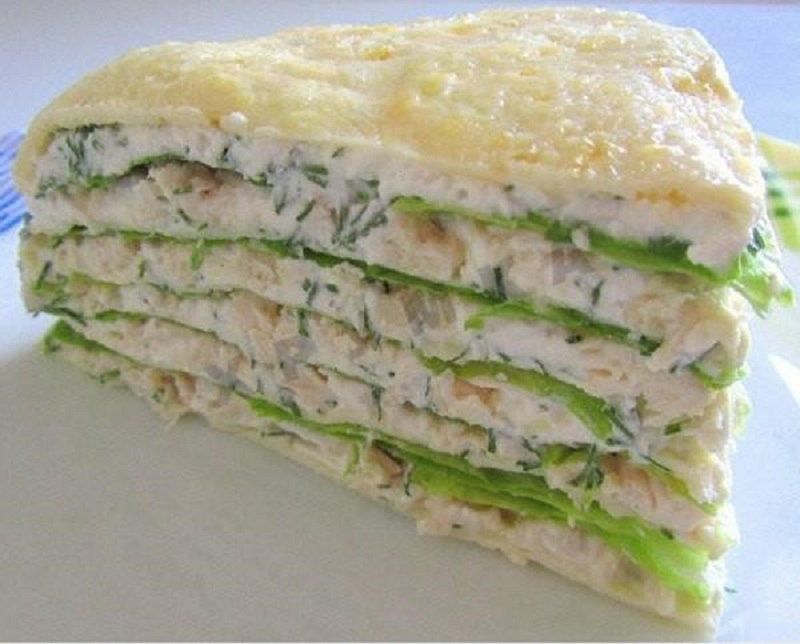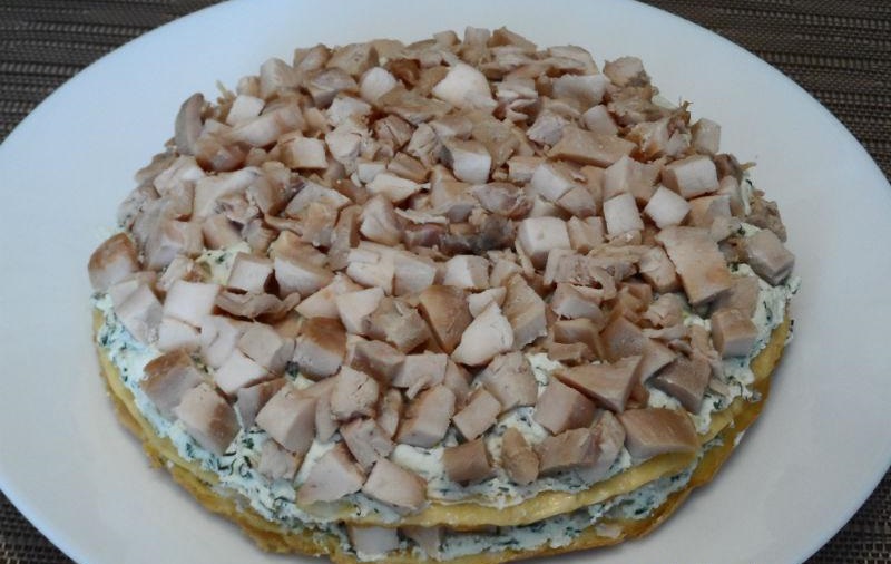 5. Pe deasupra, adăugăm jumătate din cantitatea de piept de pui. Procedăm la fel cu restul ingredientelor.