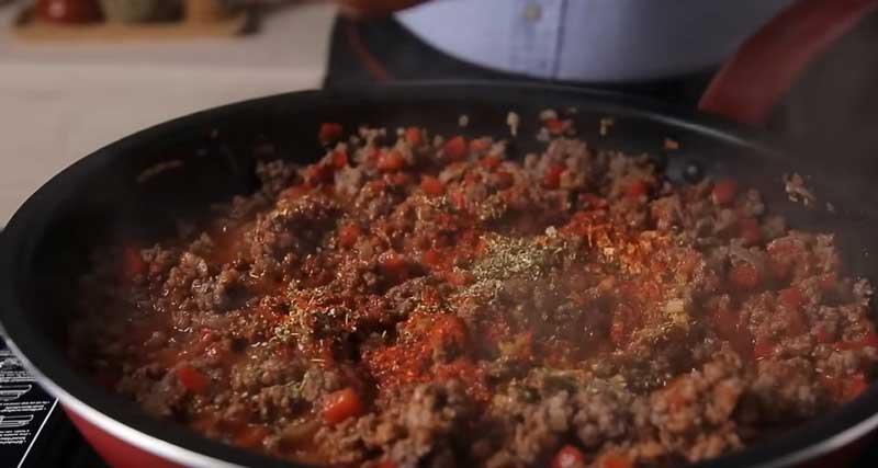 Căliți ceapa tocată într-o tigaie, apoi adăugați carnea tocată.