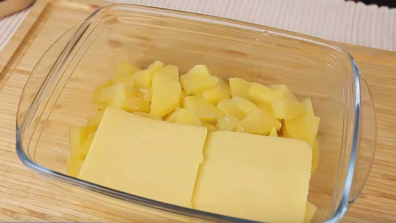 Tăiați și fierbeți cartofii în apă sărată până când devin moi.