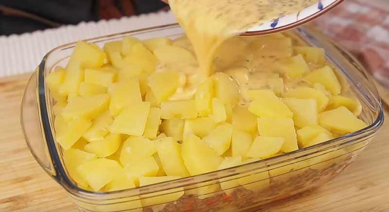 Stratificați ingredientele într-o tavă de copt așa cum vedeti in poza și turnați peste amestecul de ouă și lapte.