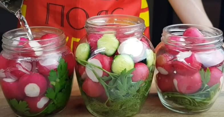 Astăzi am opărit ridichile de trei ori. Torn prima oară apă clocotită, închid borcanele cu capace și le las 5–6 minute. Scurg apa, torn din nou apă clocotită și mai las 5–6 minute. Apoi scurg din nou apa într-o cratiță.