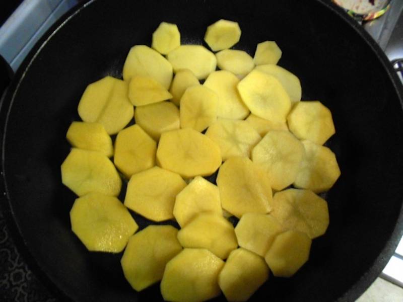 Intre timp, curatam ceapa si o taiem solzisori. Punem ceapa pe fundul unui vas adanc. Curatam cartofii si-i taiem in felii. Punem feliile de cartofi peste solzisorii de ceapa.