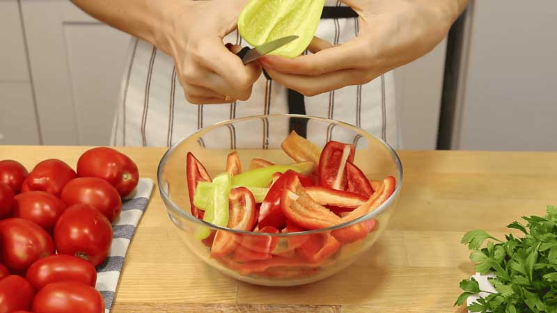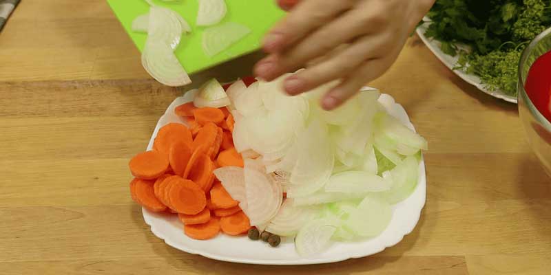 Am tăiat morcovii în rondele subțiri, ceapa în jumătate de rondele si ardeii in bucati mai maricele.