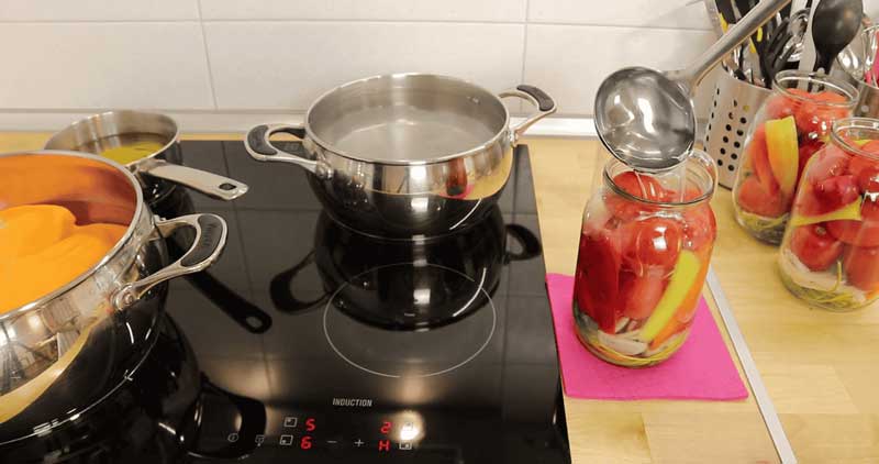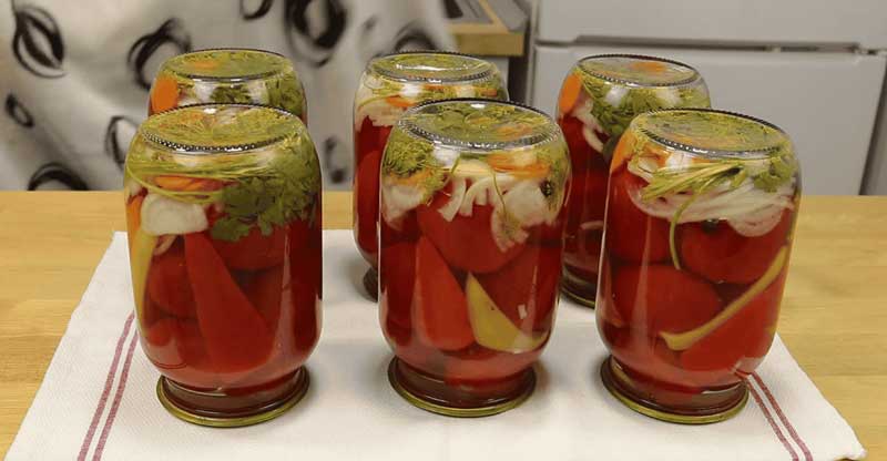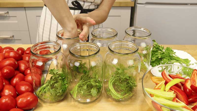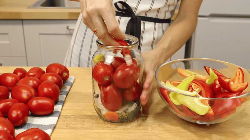 Pun si roșiile dar nuu strâns, pentru a nu crăpa. În spațiul dintre roșii și borcan pun bucăți de ardei. Asa trebuie să pregătiți toate borcanele.