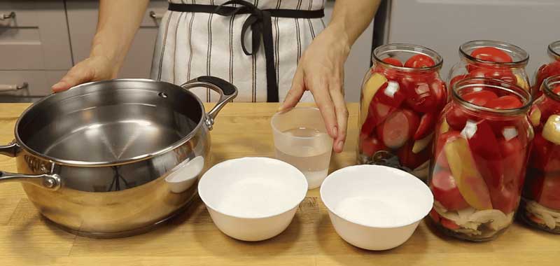 Un litru de marinata este cam pentru 2 borcane (volum 1 l) cu rosii, eu am avut 6 conserve – am crescut toate ingredientele de 3 ori.