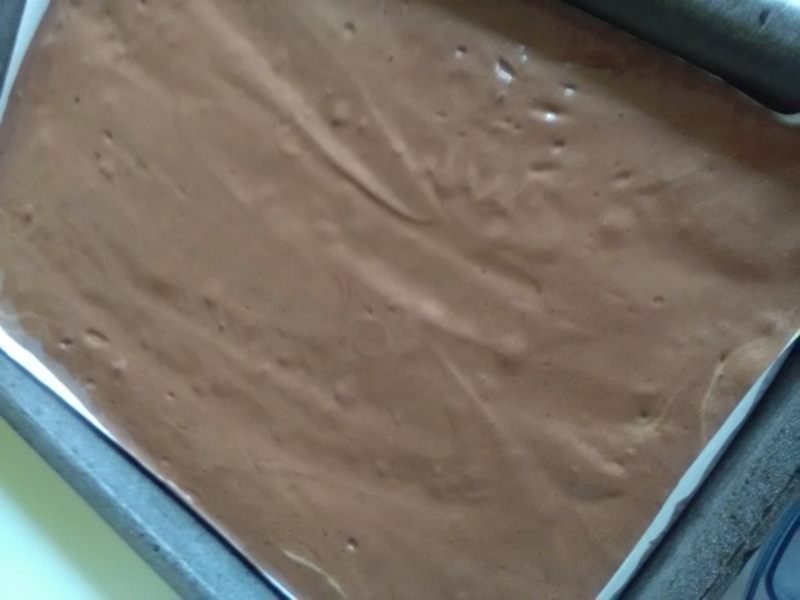 Tapetam o tava dreptunghiulara, mare (42×32 cm) cu hartie de copt. Turnam aluatul in tava si-l coacem timp de 20 de minute la o temperatura de 190 grade.