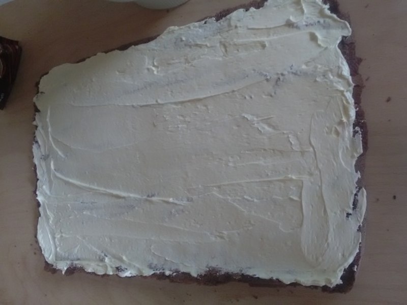 Pregatim crema. Amestecam untul moale cu zaharul pudra pana obtinem o crema neteda. Intindem jumatate din crema peste blatul de cacao.