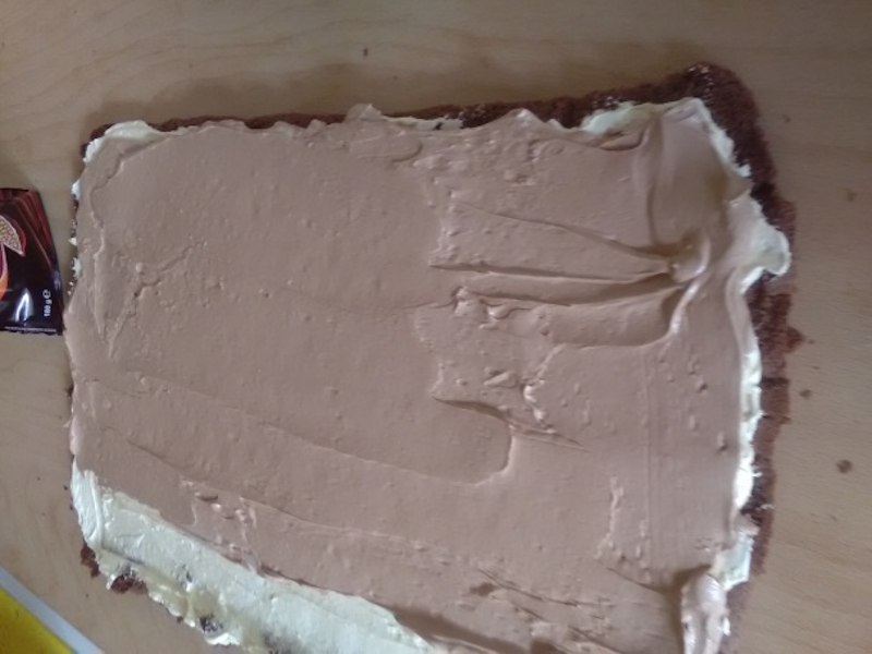 In crema ramasa, adaugam pudra de cacao. Intindem crema de cacao peste crema alba. Lasam o margine de aluat doar cu crema alba.