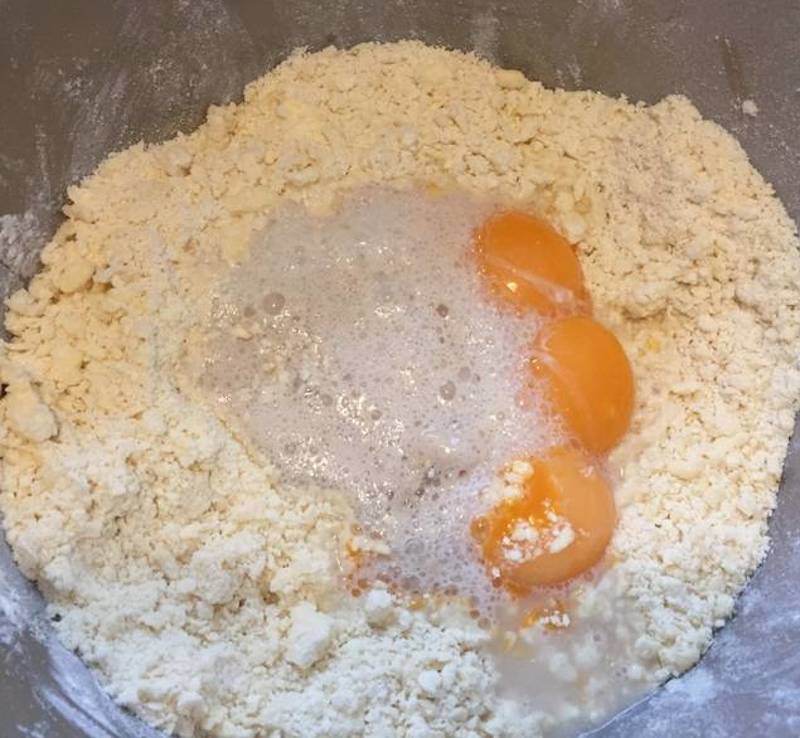 Cernem faina intr-un bol incapator. Adaugam untul moale, sarea, galbenusurile si drojdia.