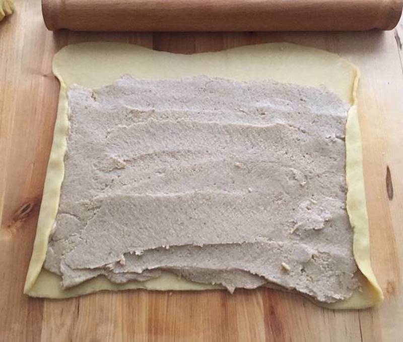 Intindem o bucata de aluat intr-o foaie dreptunghiulara. Intindem o parte din umplutura de mac deasupra. Pliem ambele margini si rulam aluatul.