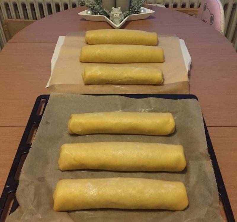 In acelasi mod vom pregati si celelalte 5 rulade. Vom avea 3 rulade cu seminte de mac si 3 rulade cu nuca. Asezam ruladele in tava la o distanta minima de cel putin 2.5 cm una fata de cealalta.
