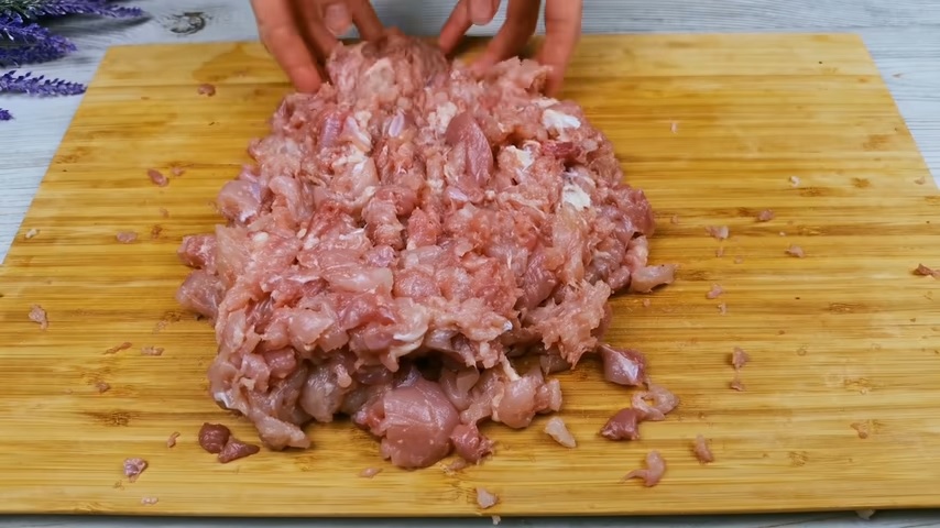 Între timp, tăiem pulpele în bucățele și mărunțim. Procedăm la fel și cu pieptul de pui.