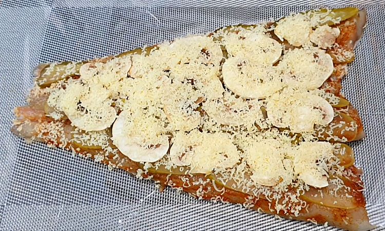 Așezați fileurile pe o suprafață de lucru sau pe o placă mare. Tăiați castraveții murați în cercuri subțiri și distribuiți-i uniform peste fileuri. Tăiați ciupercile în felii subțiri și așezați-le uniform peste castraveți. Radeți cascavalul pe o răzătoare mare și presărați-l uniform peste ciuperci.