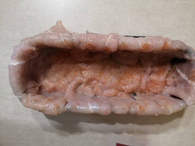 De asemenea, carnea trebuie sa cada si pe marginile tavii in exterior, pentru ca la final sa putem acoperi umplutura. Condimentam carnea cu sare si condimente pentru pui