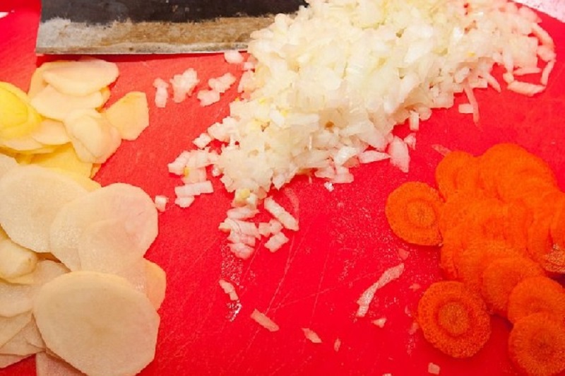 Morcovii îi tăiem rondele. Ceapa o tăiem mărunt iar cartofii felii.
