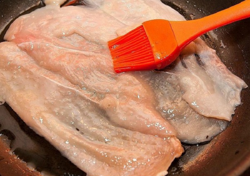 Cu ajutorul unui cuțit, tăiem pieptul de pui felii, pe urmă îl condimentăm cu sare și piper.