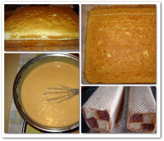 Ungem cele 3 foi de napolitană cu crema caldă, apoi așezăm două fâșii de blat, una neagră, una albă, în mijlocul fiecărei foi. Deasupra fâșiilor punem alte două fâșii: peste cea neagră punem o fâșie albă și invers. Pentru a lipi fâșiile între ele, le ungem cu crema de caramel.