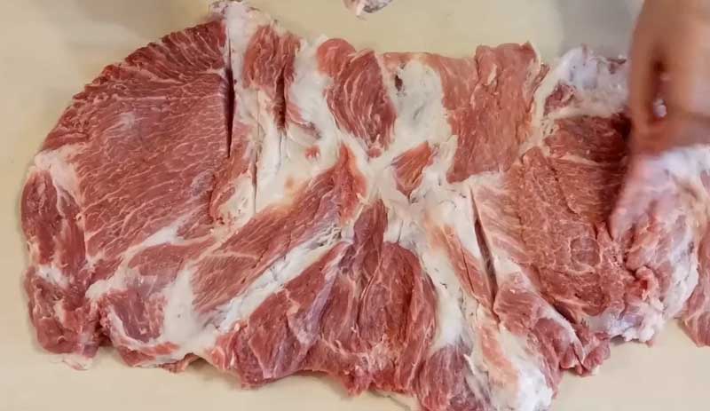 Spălați și uscați carnea de porc. Tăiați carnea astfel încât să obțineți un strat de aproximativ +-1,5 cm grosime. Bateți carnea cu ciocanul de șnițele.