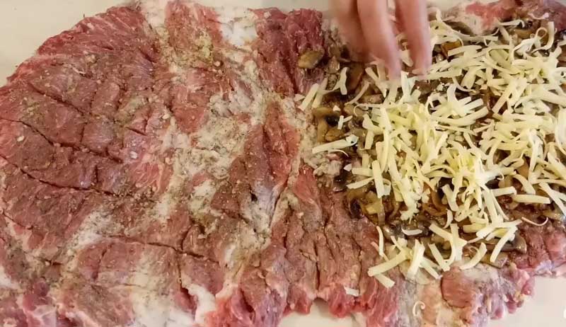 Condimentati carnea de porc cu sare, piper, usturoi zdrobit. De asemenea, puteți folosi diverse condimente: paprika, khameli-suneli, etc. Frecați bine toate condimentele în carne. Așezați ciupercile prăjite și cascavalul ras pe o jumătate a ruloului.