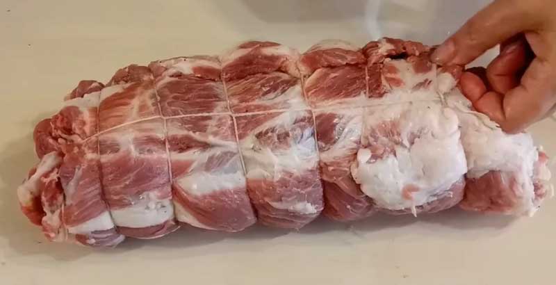 Rulați carnea de la partea cu umplutura și legați-o cu sfoară pentru a-și menține forma în timpul și după coacere.
