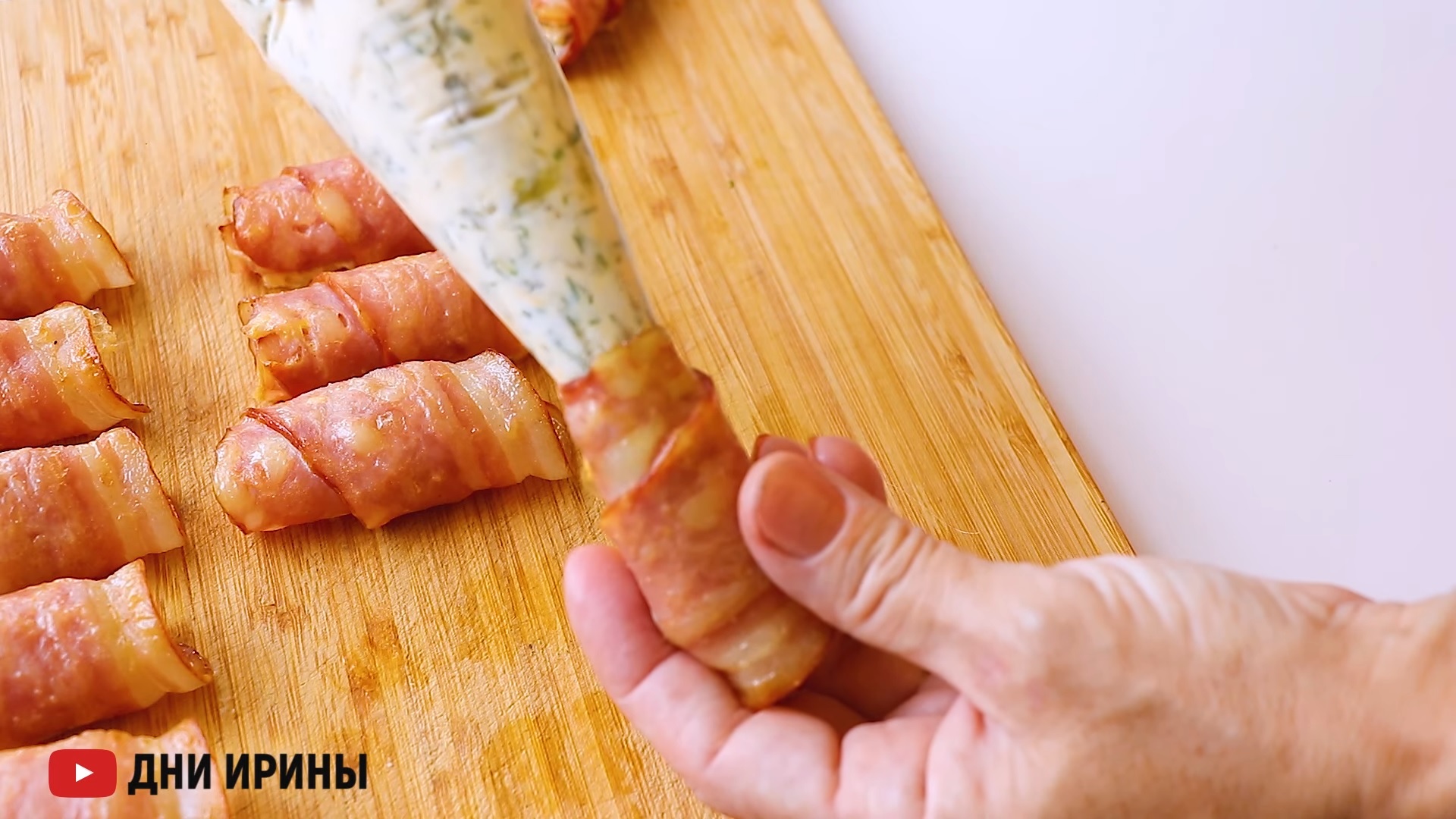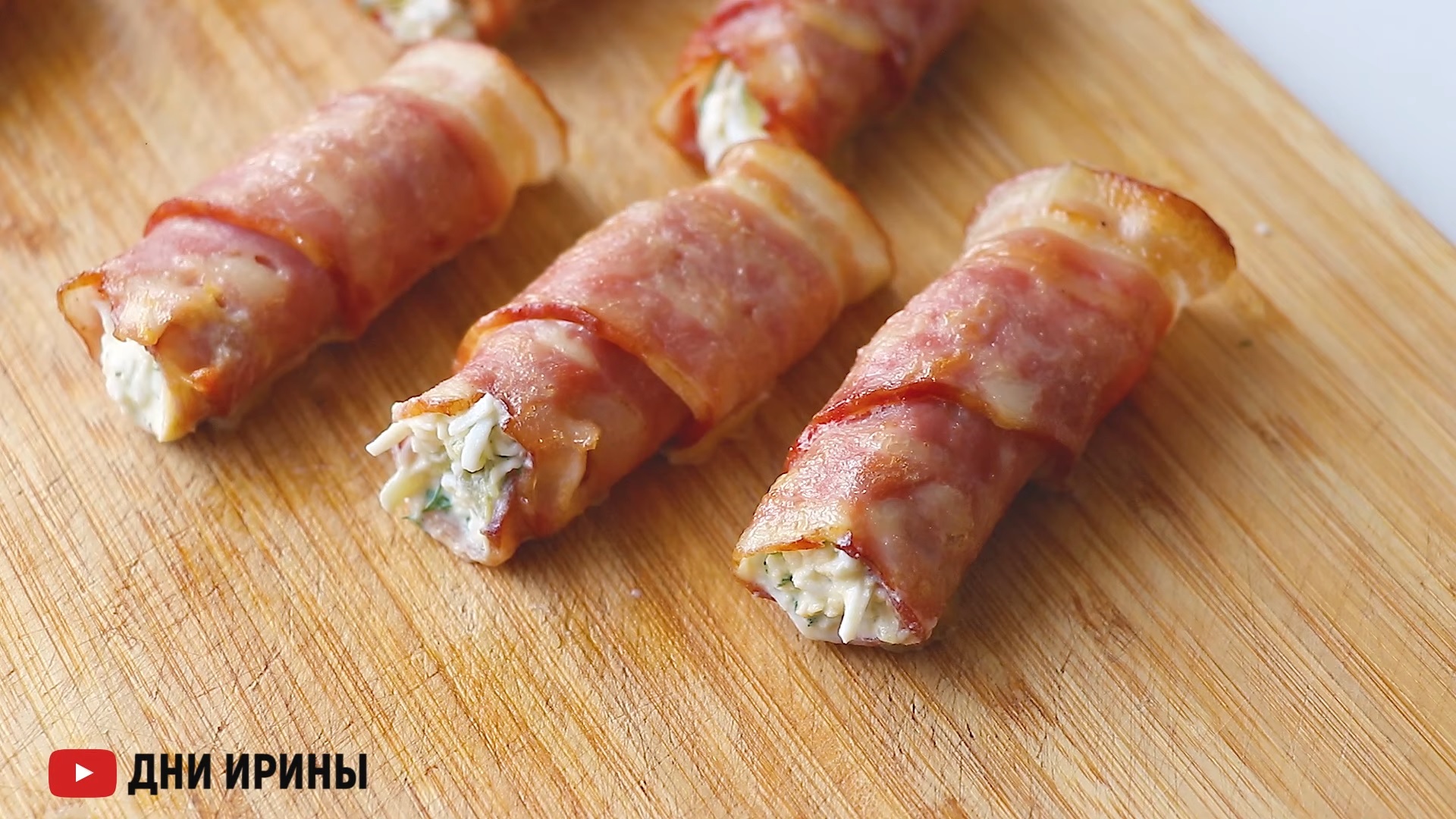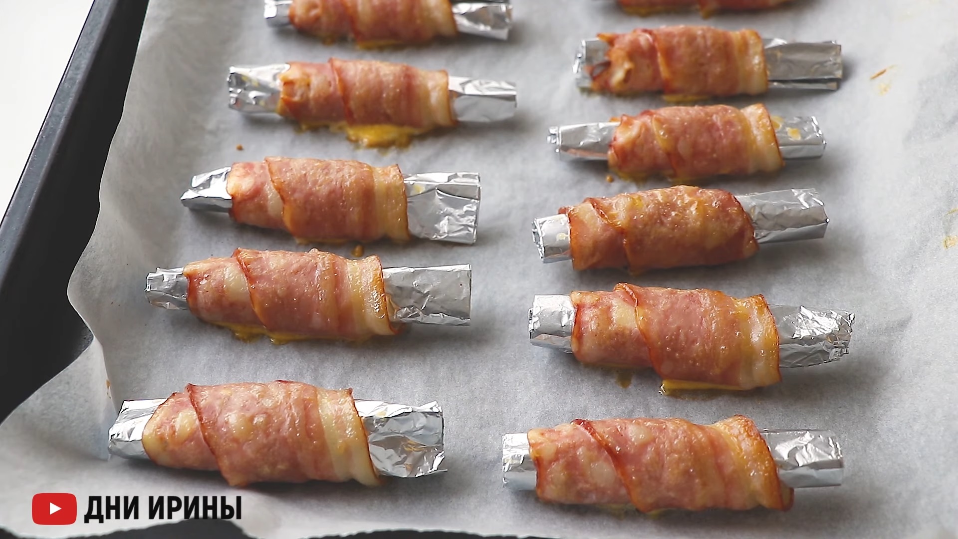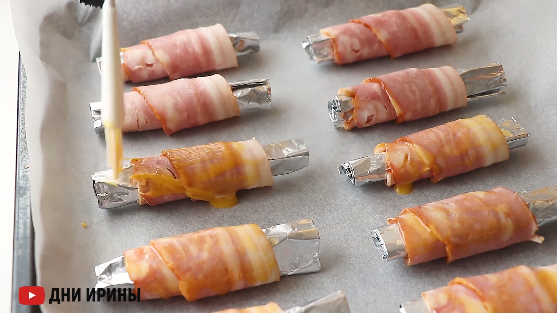 În jurul fiecărui cilindru înfășurăm câte o felie de bacon. Le așezăm pe o tavă tapetată cu hârtie de copt și le ungem cu 1 gălbenuș. Dăm tava la cuptorul preîncălzit la 180 de grade pentru 8-10 minute.