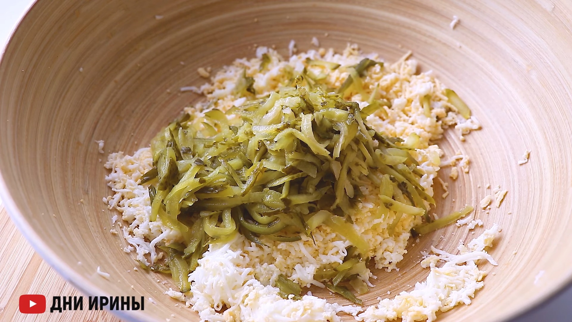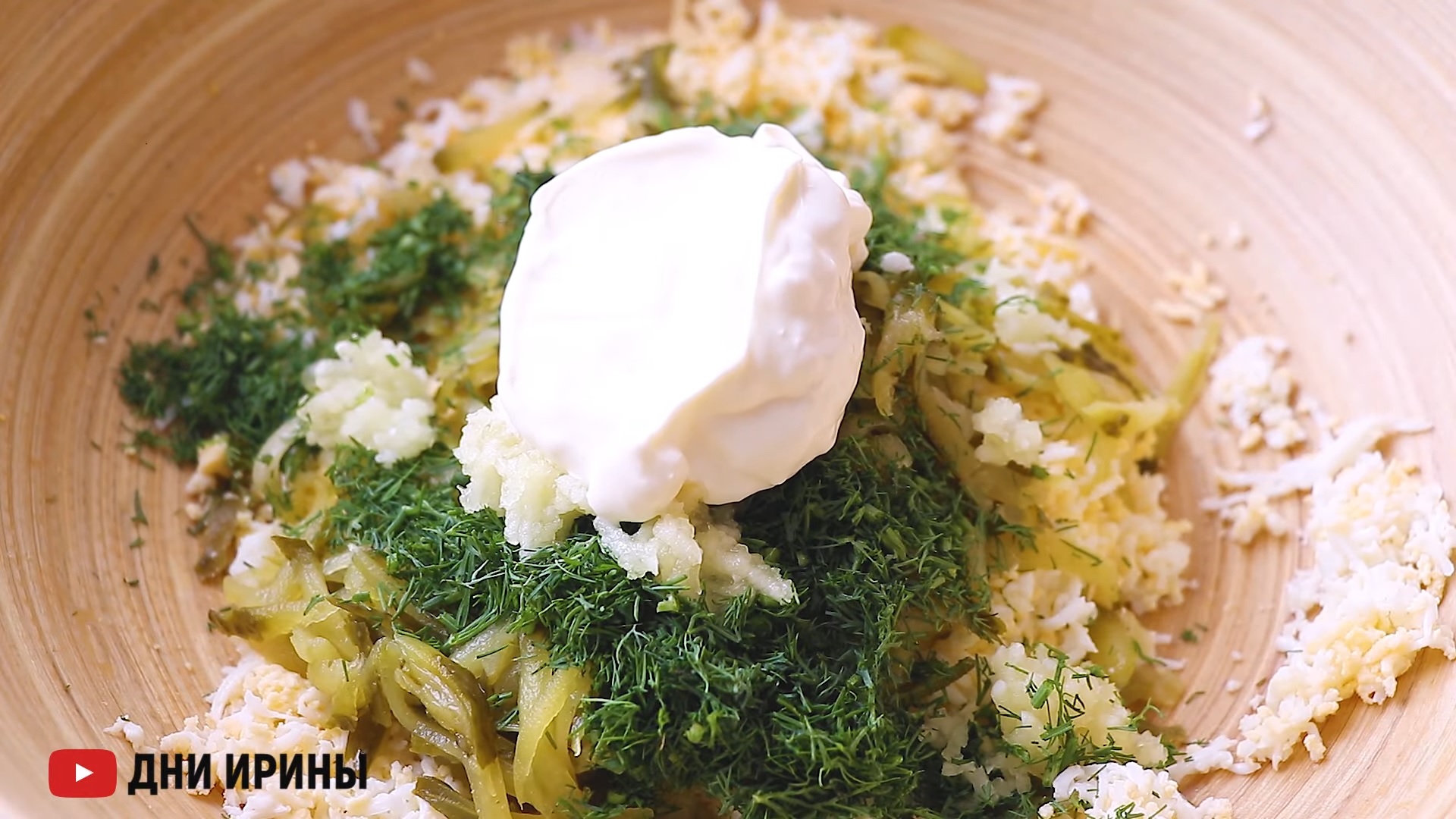 Pentru umplutură, dăm ouăle fierte pe răzătoarea mică. Dăm castraveții pe răzătoarea mare, tocăm mărunt mărarul și pisăm usturoiul. Într-un bol, amestecăm ouăle cu sare, castraveți, mărar, usturoi și la final încorporăm și smântâna.