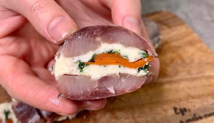 Distribuiți umplutura pe file, puneti mărar, întindeți fâșii de morcovi marinați și înfășurați-o strâns într-un rulou. La fel ca prima rețetă, puneți-o la frigider pentru 2-3 ore, de preferință peste noapte.