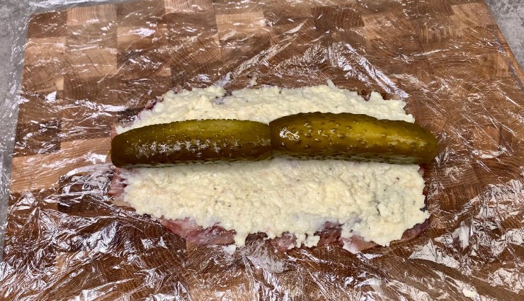 Distribuiți umplutura pe file, întindeți deasupra castravetele murați, înfășurați-l strâns într-un rulou și puneți-l la frigider.