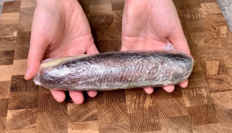 Puneți umplutura pe fileul pregătit, împachetați-o strâns într-un rulou, apoi înfășurați-o în folie alimentară și puneți-o la frigider pentru cel puțin 2-3 ore, dar este mai bine să o lăsați peste noapte.