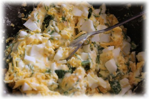 2. Pentru umplutură, dăm ouăle fierte prin răzătoarea mare. Adăugăm brânza, verdeața tăiată mărunt, sarea, piperul și amestecăm bine bine…