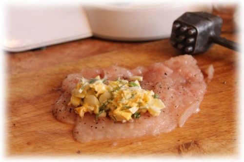 3. Așezăm câte o lingură de umplutură pe fiecare bucățică de carne.