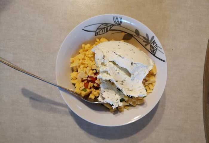 Taiem si cascavalul in cubulete mici si il adaugam in castronul cu legume. La final, adaugam crema de branza si amestecam, astfel incat sa se combine ingredientele.