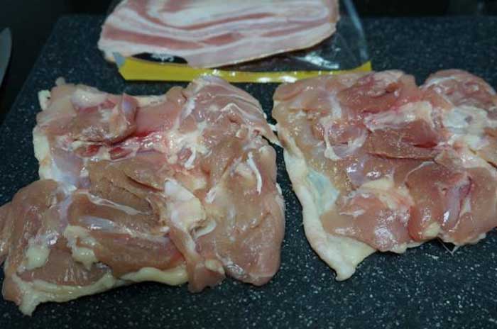 Pentru inceput vom pregati pulpele de pui. Le vom taia in doua si le vom intinde pe o masa (nu indepartam pielea). Deasupra puiului punem fasii de bacon.