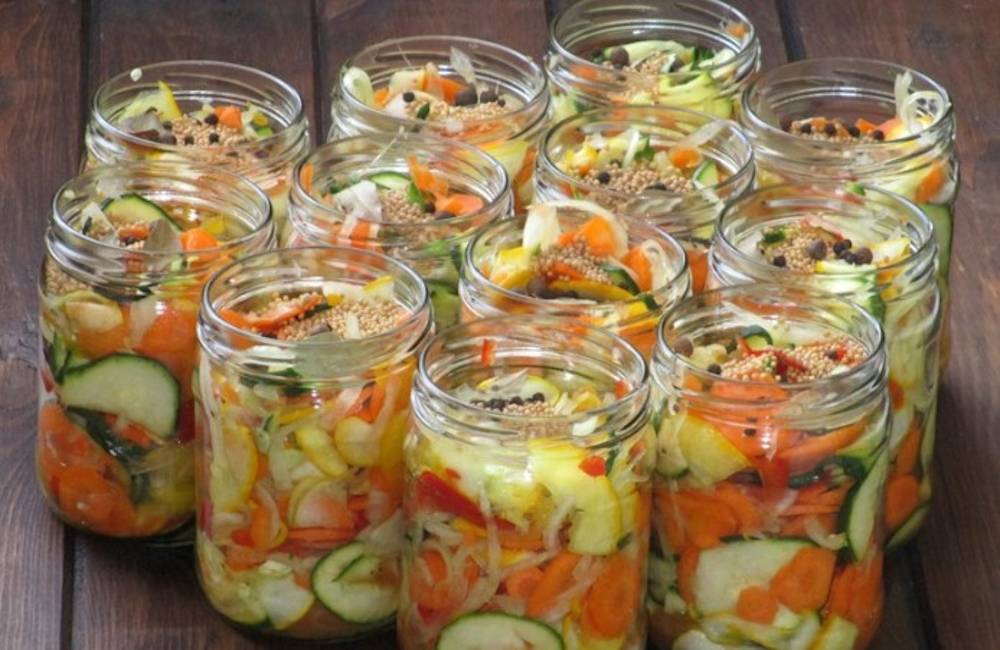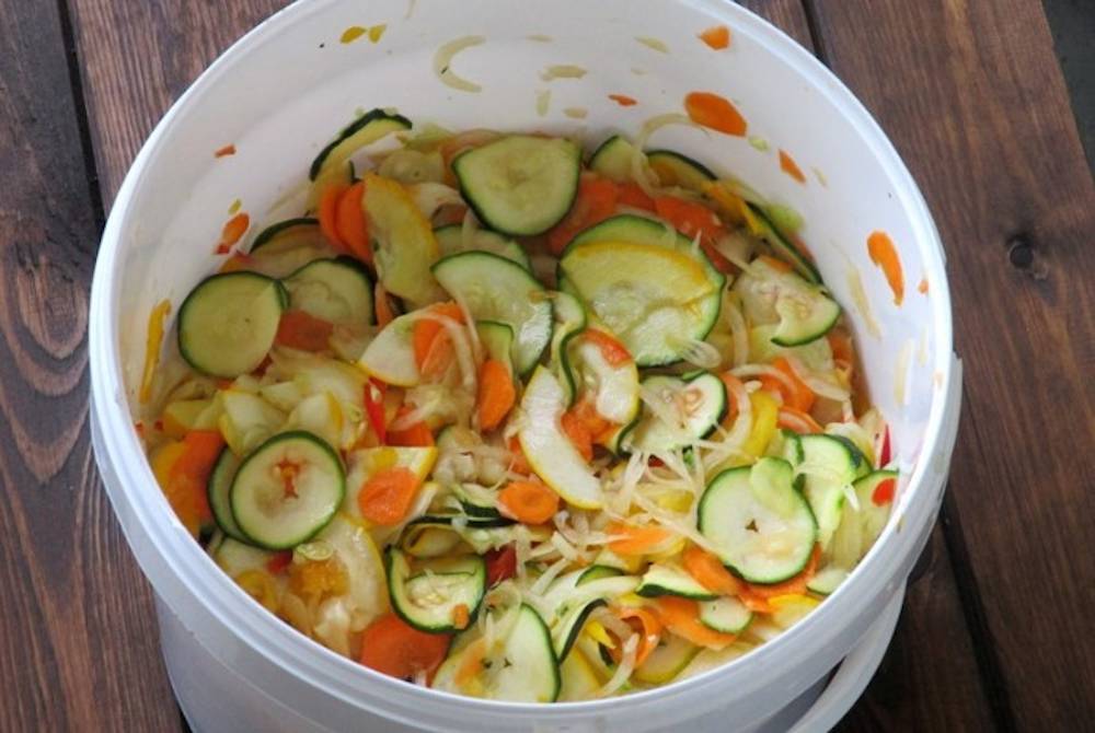 Pune toate legumele taiate intr-un recipient. Adauga sare si amesteca bine.Spala bine borcanele in care urmeaza sa pui salata de dovlecei. Umple borcanele cu acest amestec de legume. In fiecare borcan adauga o lingurita de boabe de mustar, cateva boabe de piper, 2-3 cuisoare si o frunza de dafin.
