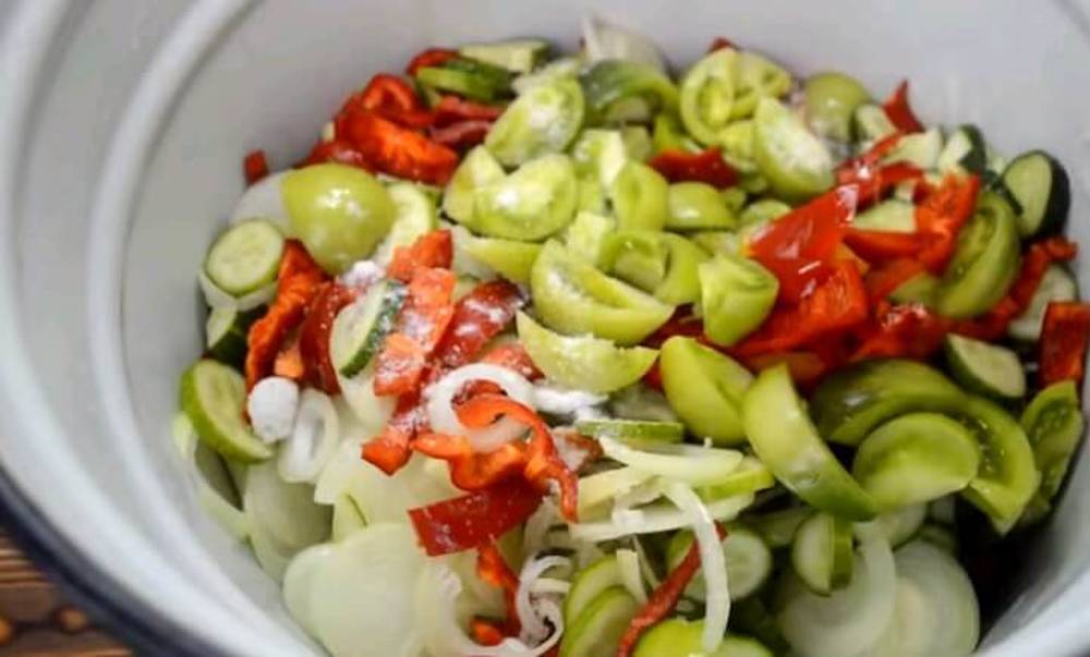 Castravetii ii taiem in cercuri, iar gogonelele, in functie de marime, le taiem in 4 sau 6 bucati. Combinam toate legumele taiate intr-un bol mare. Adaugam patrujel tocat, sare si zahar.