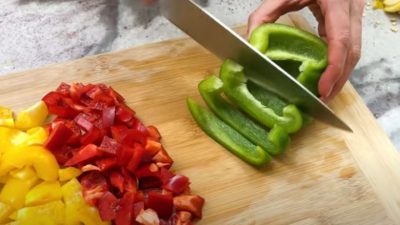 Spălați bine toate legumele. Curățați ardeii de semințe și tăiați-i în felii, apoi în cubulețe mici. Puneți ardeii într-un bol mare.