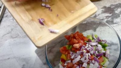 Curățați ceapa și tăiați-o în cubulețe mai mari. Puneți toate legumele tăiate în bol și amestecați-le ușor. Tăiați brânza feta în cubulețe.