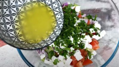 Tocați mărunt pătrunjelul proaspăt și adăugați-l în bol. Într-un bol separat, turnați uleiul de măsline și adăugați sucul de lămâie, amestecând bine dressing-ul.
