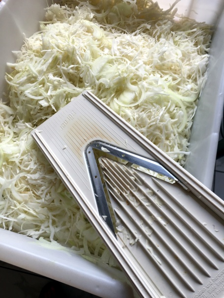 Se da varza printr-o razatoare si se pune intr-un vas incapator. Se curata ceapa, se taie solzisori si se pune in vasul cu varza.