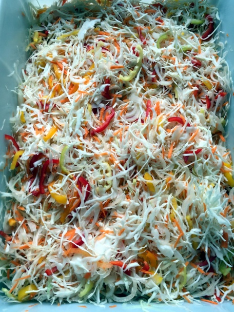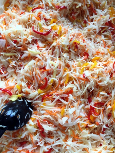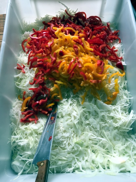 Ardeii grasi se spala bine, se taie fasii si se adauga in amestecul de varza si ceapa. Daca doresti, poti adauga si cativa ardei iuti.
