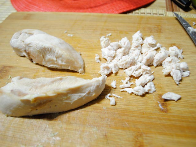 1. Pentru început, fiermbem carnea de pui. După ce s-a răcit, o tăiem bucățele.