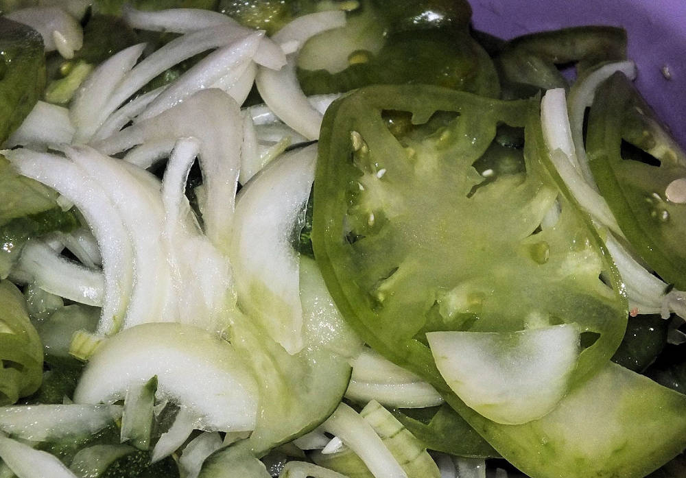 Clatim in cateva ape reci castavetii si rosiile verzi, apoi le uscam si le taiem felii. Decojim ceapa, o clatim si o taiem solzisori. Intr-un vas incapator punem rosiile verzi, castravetii si ceapa.