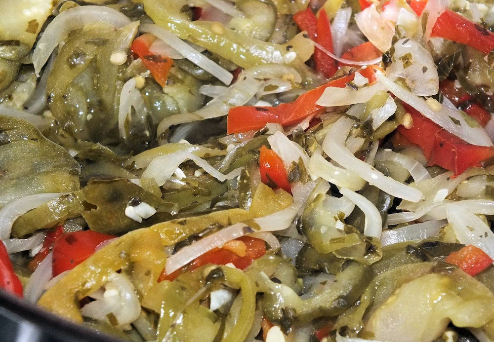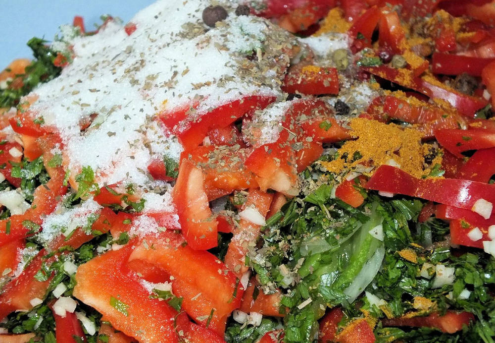 Taiem ardeii grasi rosii, indepartam cu grija semintele, ii clatim si ii taiem in fasii. Decojim usturoiul si il taiem in cubulete. Clatim, uscam si tocam patrunjelul verde.