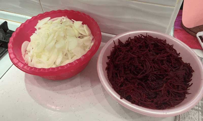 Sfecla si ceapa trebuie curatate de coaja. Am tăiat ceapa în jumătate si mai apoi in rondele subțiri. Sfecla trebuie să fie rasă pe răzătoarea mare sau pe cea coreeana (daca aveti).
