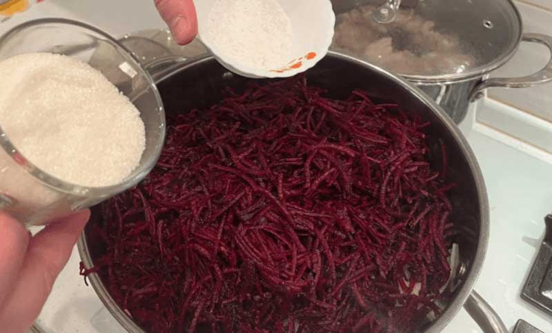 Dupa 15 minute se toarna otetul si se amesteca, se lasa sa fiarba inca 6-7 minute, apoi se iau borcanele si se pune sfecla, se poate adauga putin lichid și acoperim strans cu capace sterilizate. Important este sa puneti sfecla in borcane cat este fierbinte, imediat dupa ce a fiert.