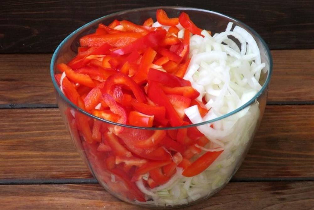 Taie ardeii rosii in doua. Scoate-le samburii, apoi taie-i in fasii. Decojeste ceapa si tai-o solzisori.