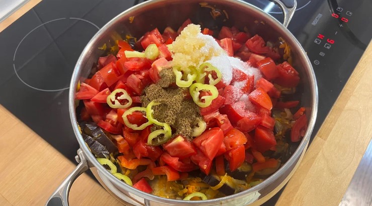 Adaug in tigaia cu vinete ardeiul gras, ardei iute, rosii, usturoi dat prin presa, sare si khameli-suneli. Acoperiți cu un capac și fierbeți timp de 20 de minute.